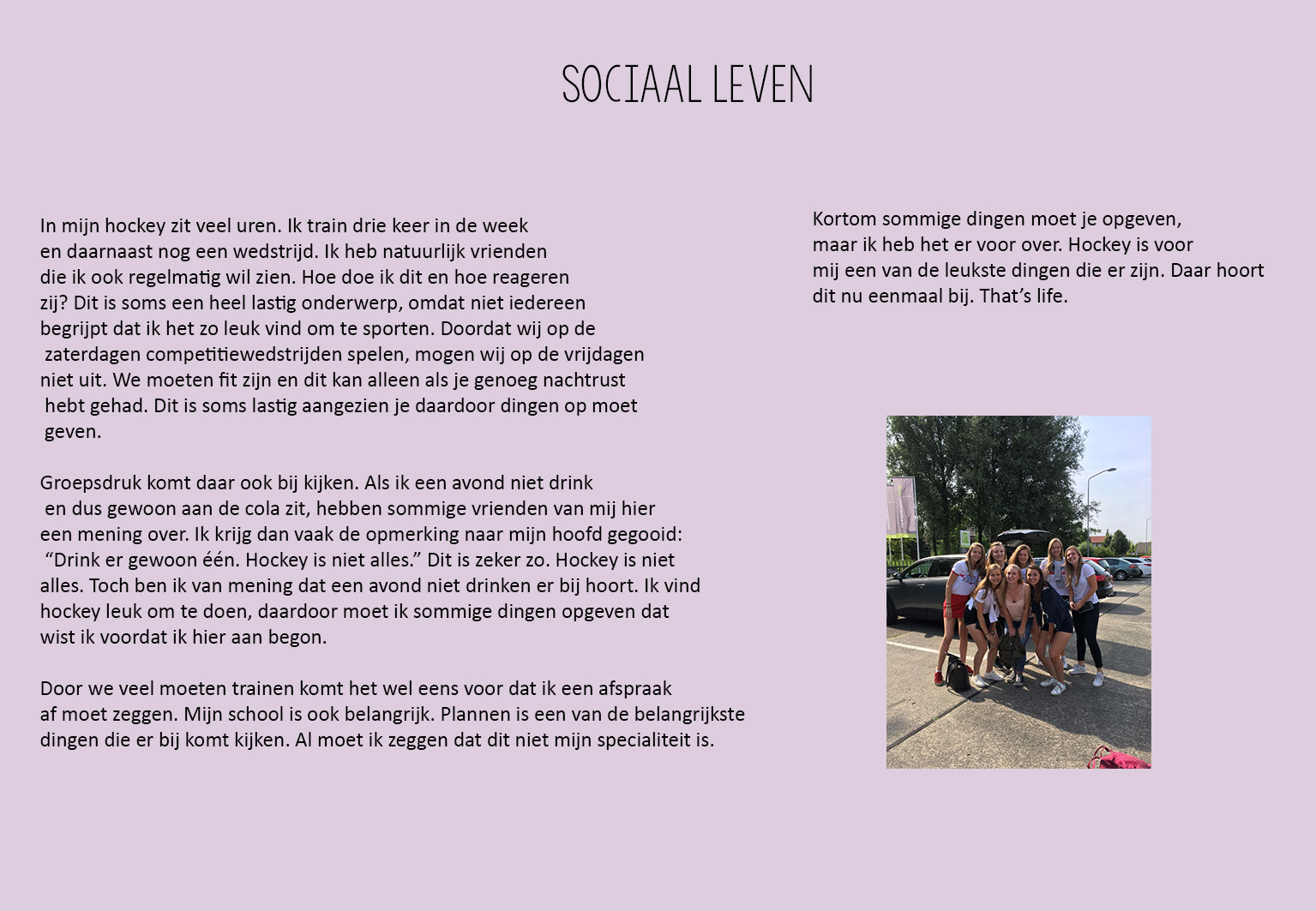 Mijn hockey kost veel tijd. Hoe combineer ik dit met mijn sociaal leven? Dat vind ik namelijk ook een van de belangrijkste dingen in mijn leven. Ik zou niet zonder mijn vrienden kunnen. Ik ga jullie dit vertellen aan de hand van een column.